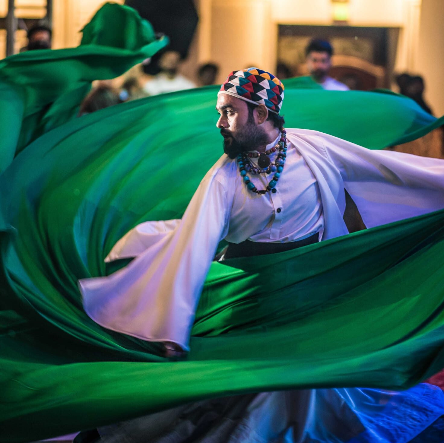 A spiritual dance form featuring whirling movements and rhythmic grace, embodying devotion and unity with the divine in Sufi tradition.